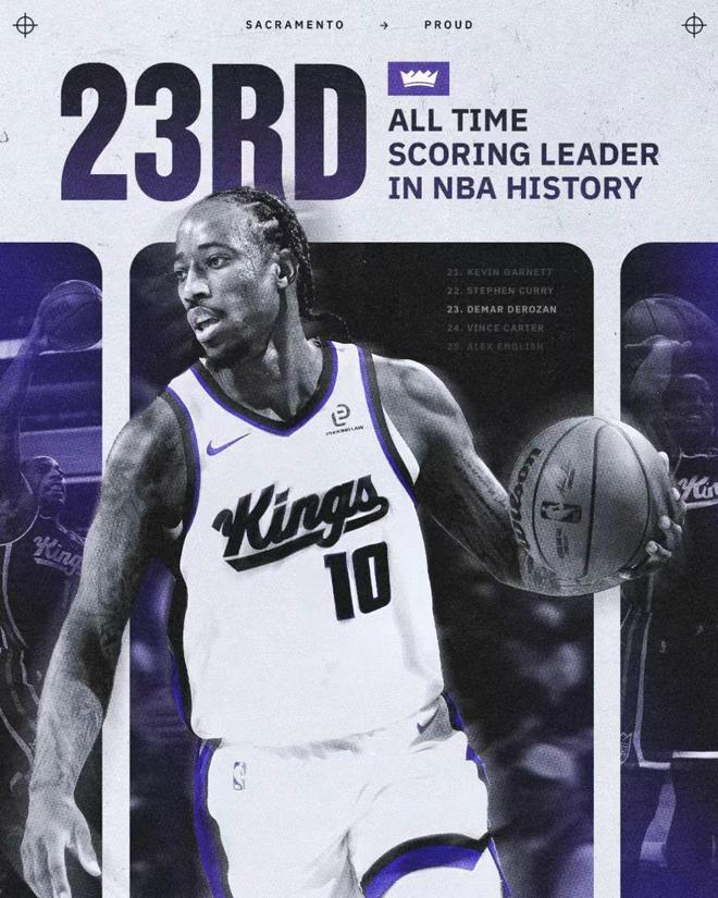 德罗赞NBA生涯常规赛总得分超越卡特25728分,升至NBA历史得分榜第23位迎来里程碑。